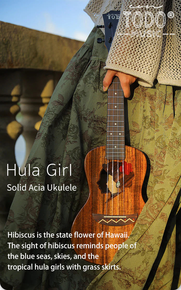 Dette designet gjør hver ukulele til en unik, personlig historie. Med Todo Hula Girl får du et instrument som er en fryd for øyet og øret.