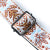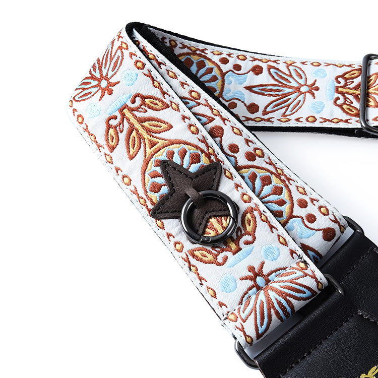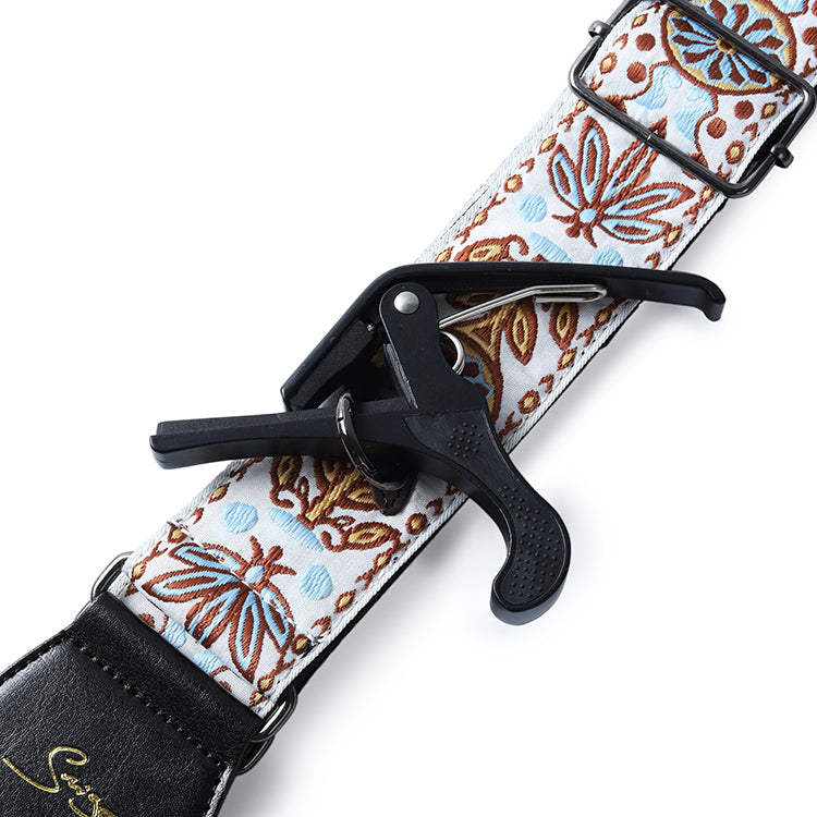 Hvit bakgrunn med blå blomster og blader. Her er det også en ring som capos og lignende verktøy kan festes til.